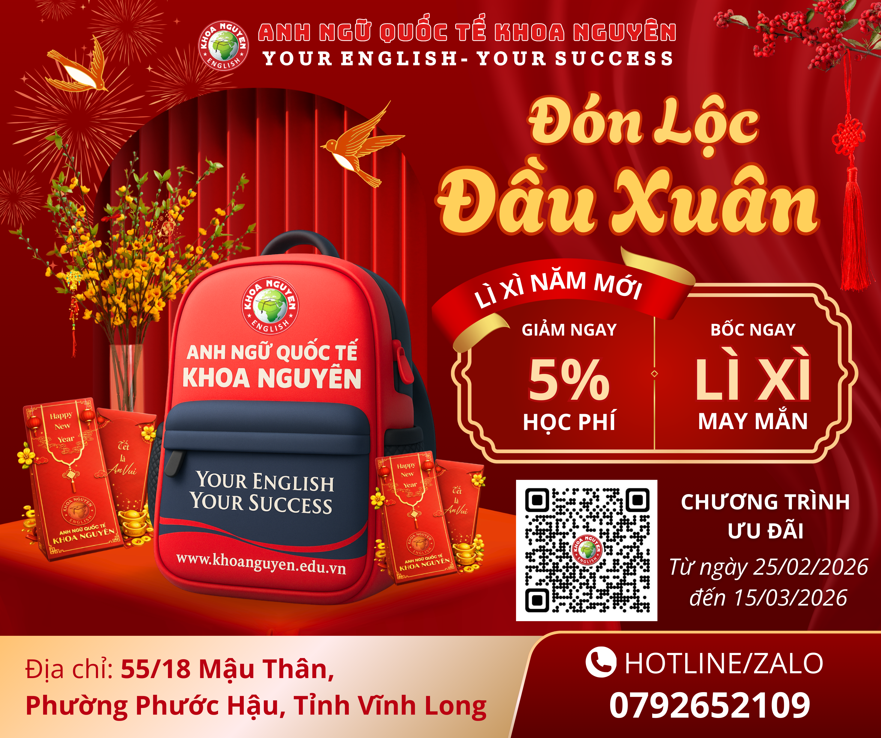 Nhằm tạo điều kiện thuận lợi cho học viên khởi động năm mới với tinh thần học tập tích cực, Anh Ngữ Quốc Tế Khoa Nguyên chính thức triển khai chương trình ưu đãi đặc biệt mang tên “Đón Lộc Đầu Xuân” 2026.